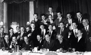 The crew in full flow are pictured with London picture editor, Gerry Cook and the legendary Frank Spooner, together with various guests, at I think a Chrissie Pissie!